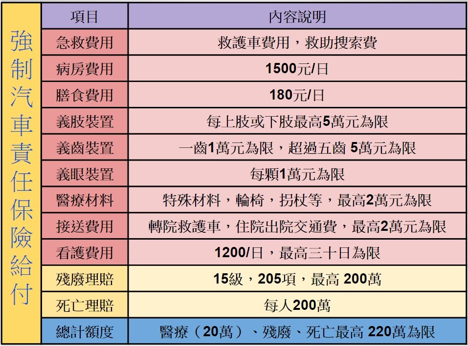 因使用或管理被保險機車發生汽機車交通事故,致乘客或車外第三人體傷、殘廢或死亡者,保險公司依本保險契約之約定,對請求權人給付保險金。 每一個人傷害醫療最高 20 萬 元,殘廢、死亡最高 200 萬元,給付總額最高 220 萬。